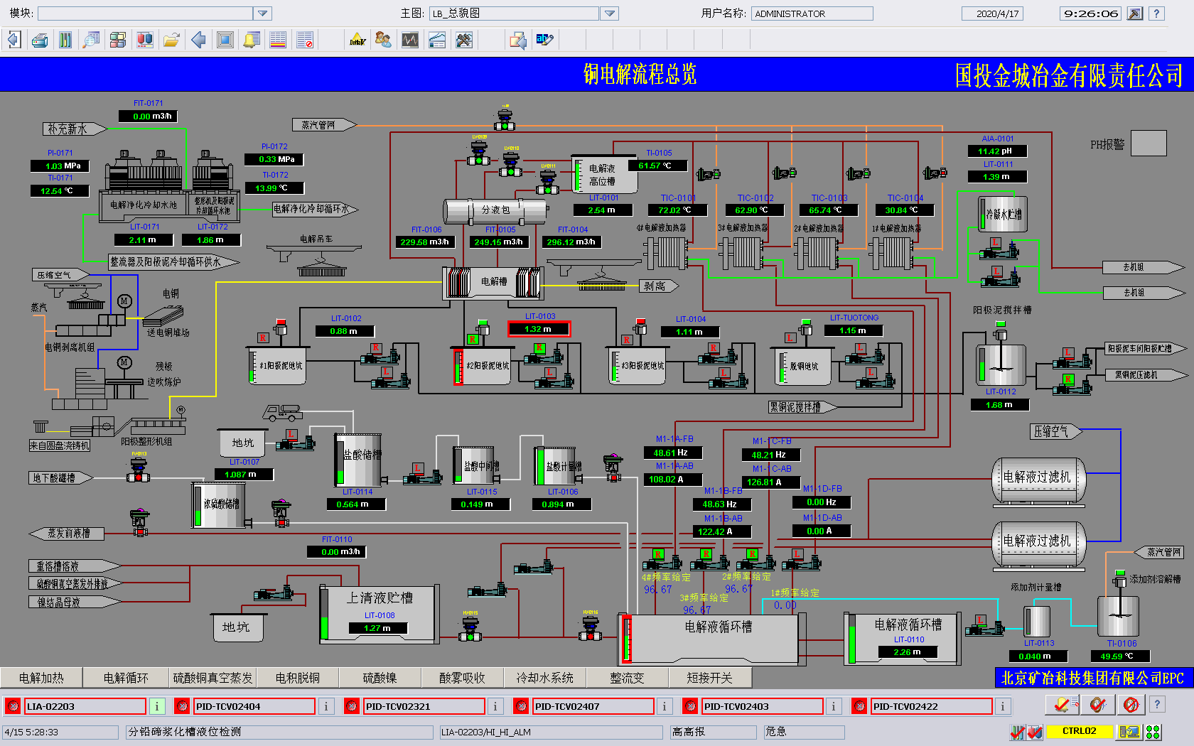 由九州体育总承包的湿法电解区域EPC工程总承包位于河南省灵宝市豫灵镇,生产流程为火法冶炼产出的粗铜,经过电解精炼产出精铜,阳极泥湿法综合回收贵金属。该工程包括电解车间和阳极泥处理车间,两车间相互独立,各设置一套DCS控制系统,均采用冗余控制器+工程师站+操作员站的架构,通过环网联通整个系统。采集的实时生产数据集中归档,并设置一台OPC客户端用于和全厂生产信息管理系统联网,实现全厂资源统一管理。DCS系统针对电解车间电解液加热调节阀频繁,设计带蒸汽压力前馈的PID温度调节,针对添加剂槽蒸汽大,重新设计仪表测量系统,稳定投料速度,减少表面凸瘤和粒子的产生。集成阳极整型机组、天车定位、电解槽短接开关系统、电解液循环过滤系统、阴极剥离机组、残极洗涤机组、真空蒸发机组等子系统,集中显示调配关联数据,方便工艺监控生产过程。